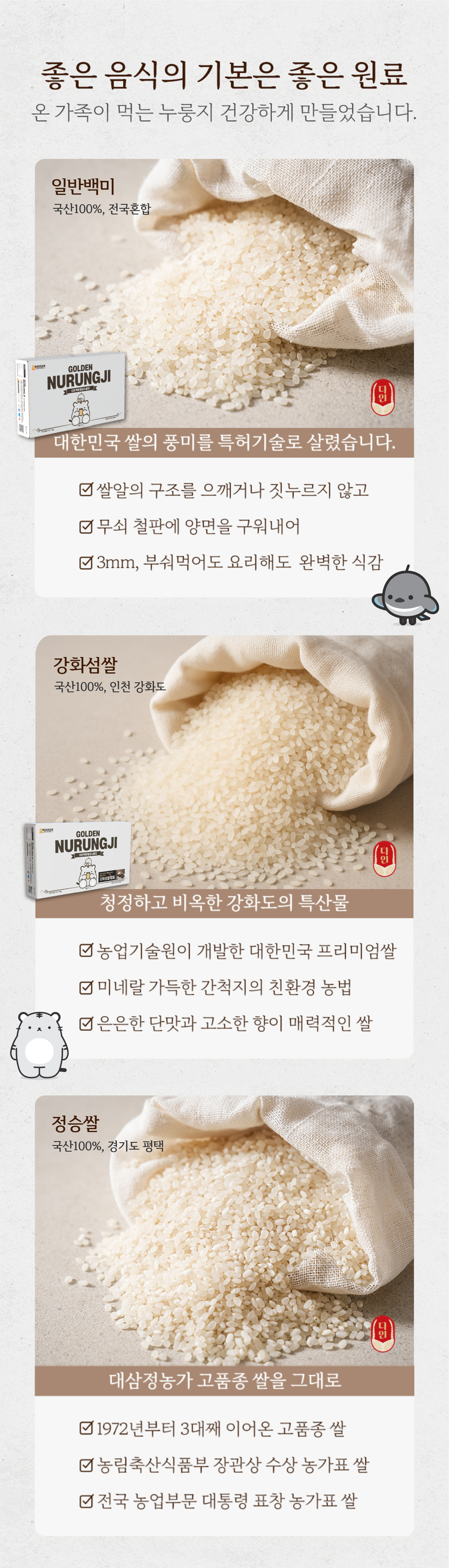 - 누룽지 제품류 특성상 배송 과정 중 기사님의 배송방식에 따라 자연스러운 깨짐 및 부서짐이 발생할 수 있으며, 이는 교환/환불 사유가 되지 않습니다.