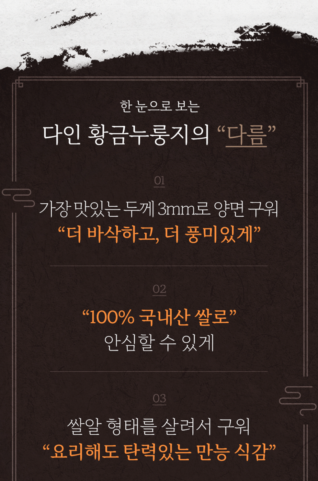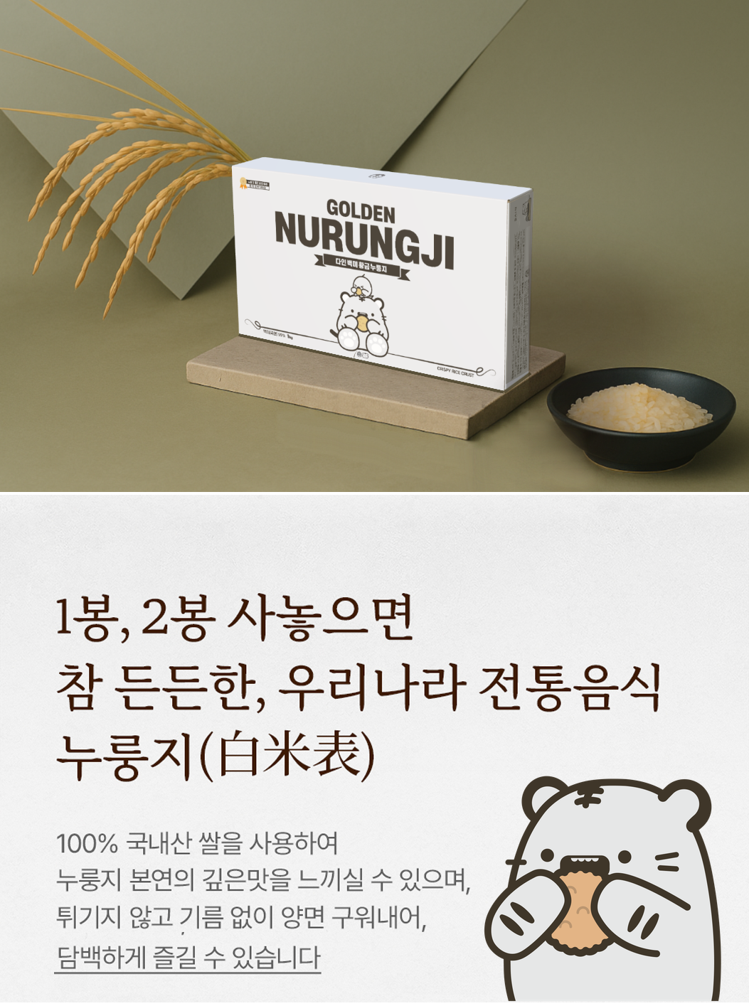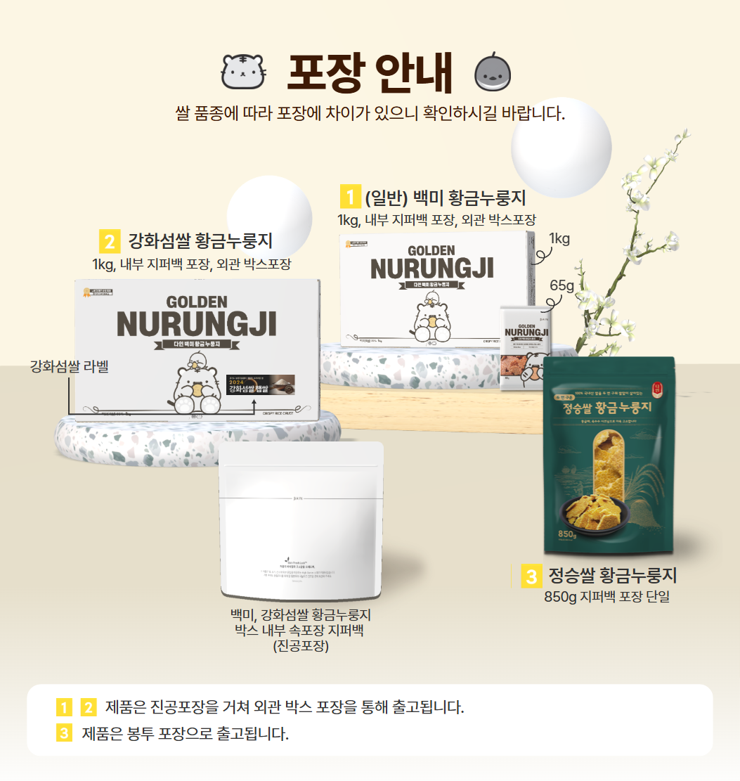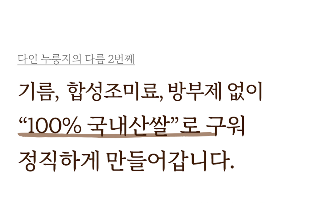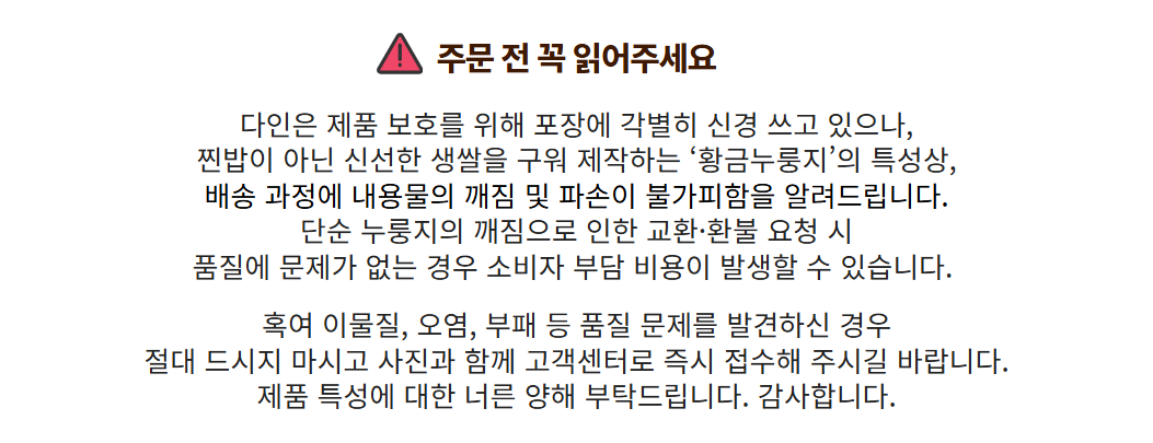 - 누룽지 제품류 특성상 배송 과정 중 기사님의 배송방식에 따라 자연스러운 깨짐 및 부서짐이 발생할 수 있으며, 이는 교환/환불 사유가 되지 않습니다.