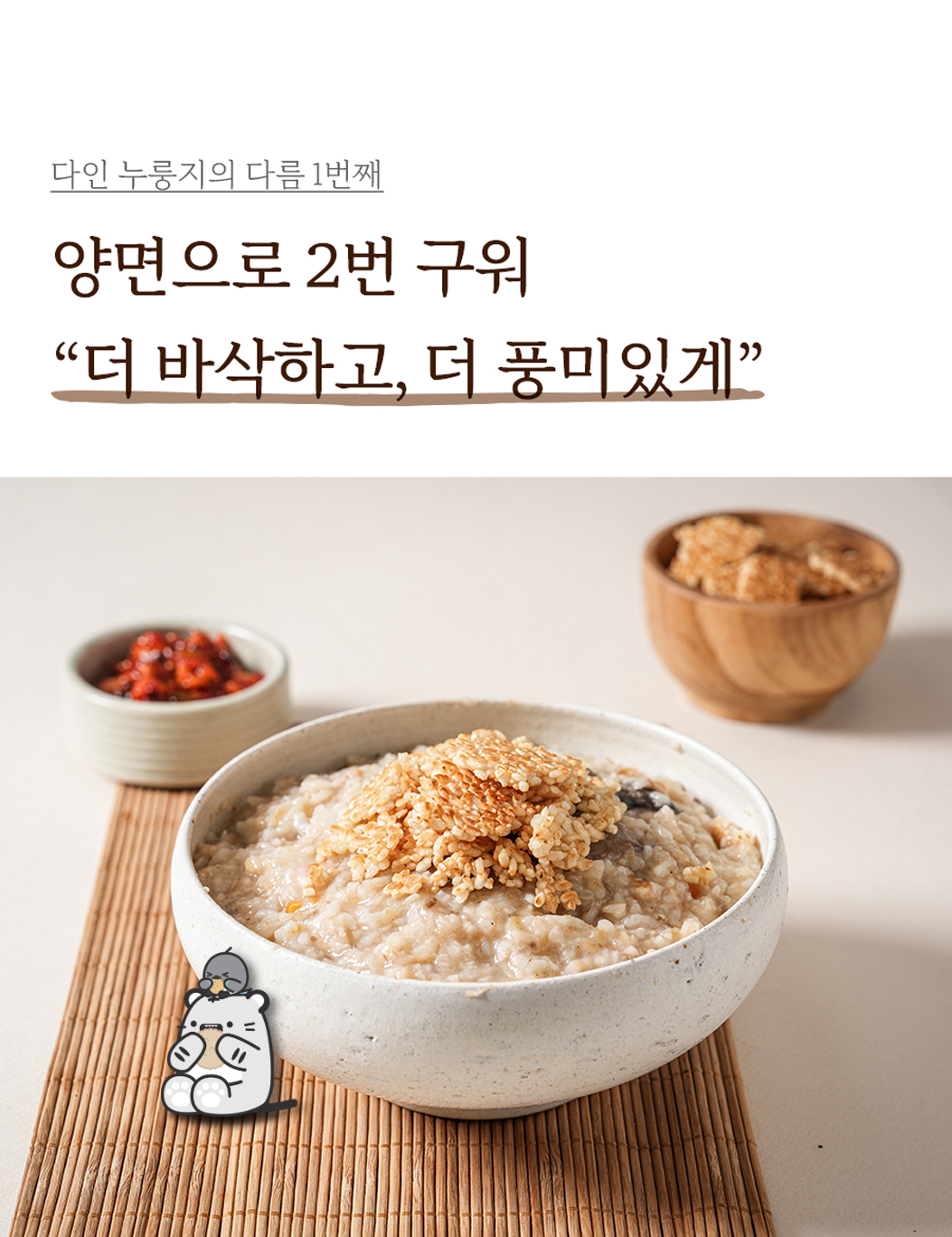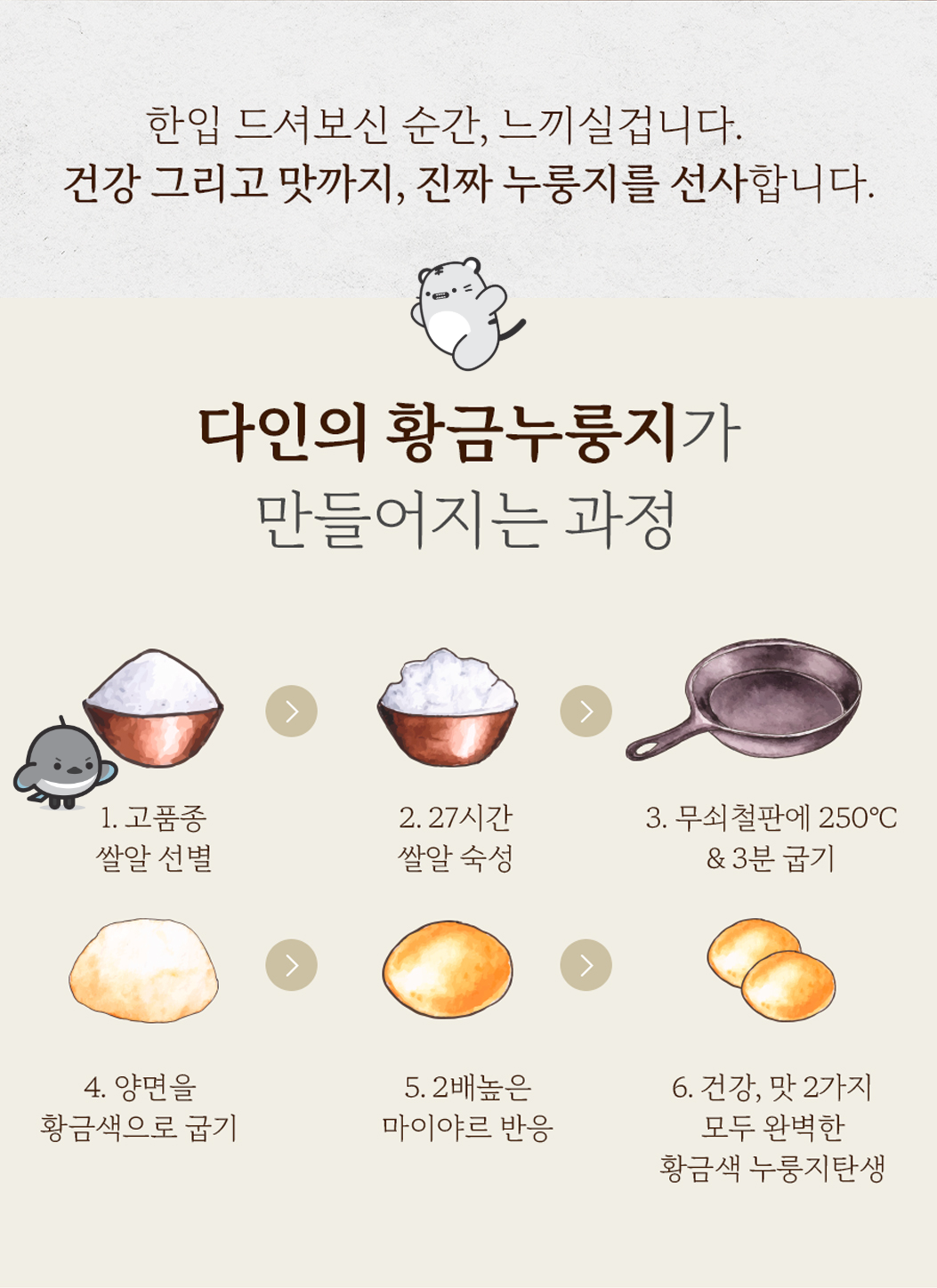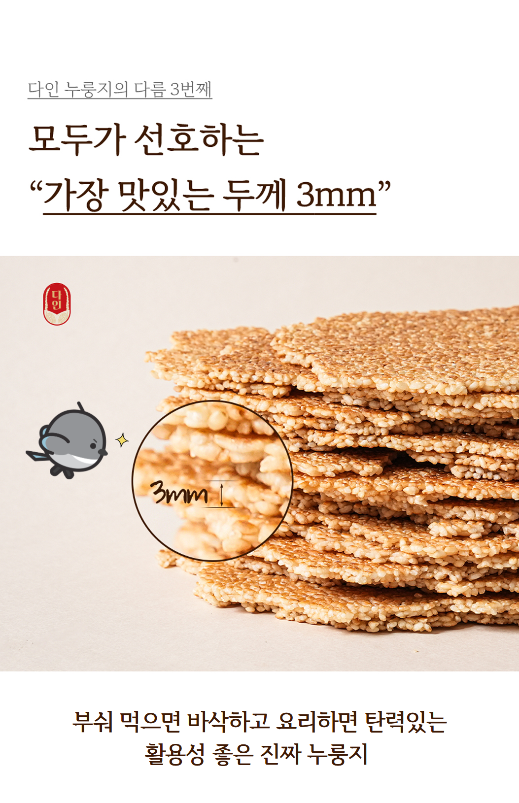 - 누룽지 제품류 특성상 배송 과정 중 기사님의 배송방식에 따라 자연스러운 깨짐 및 부서짐이 발생할 수 있으며, 이는 교환/환불 사유가 되지 않습니다.