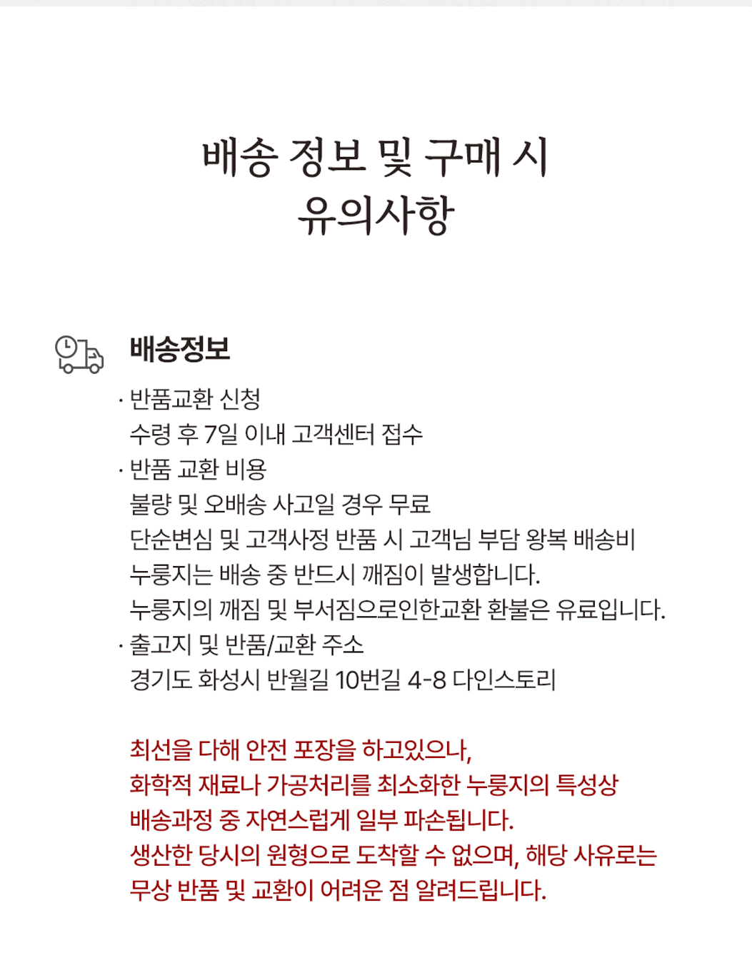 배송 출발 | 영업일 기준 오전 10시 주문건 당일 출고 (주문이 몰리면 익일 출발할 수 있습니다.)